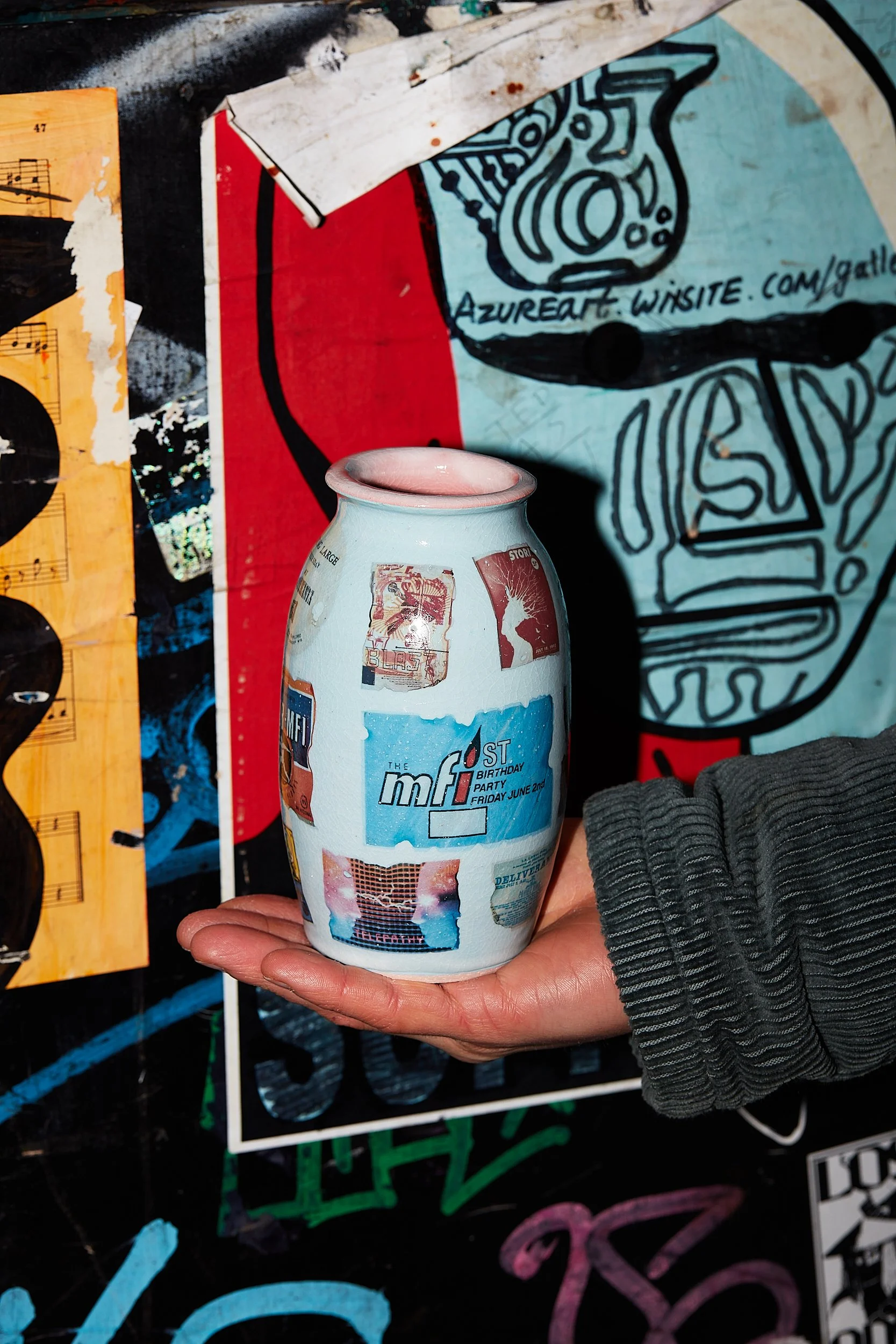 This new series of work explores this theme through a series of Stoneware vases, celebrating discarded flyers, images, and memories. Each piece is hand thrown on a traditional potters wheel by studio potter James Sims, and fired to 1,220°C. It is then glazed and fired again, before transfers are added, and fired for a third time.
